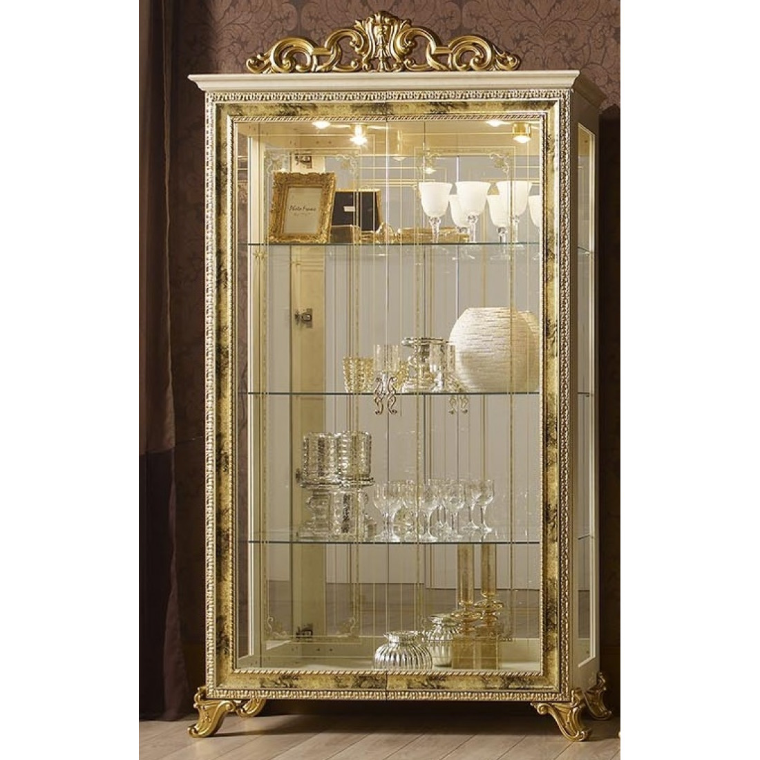 Шкаф-витрина двухдверная Катя (беж) - выполнена в классическом стиле от Российской фабрики "ДИА мебель". Большие стеклянные полки и корпус из зеркала придаст чувства легкости и визуально поможет расширить комнату. Выполнена в бежевом цвете с элементами позолоты на фасаде. Такая шкаф-витрина будет не заменима для маленькой гостиной и удивит Вас своей многофункциональностью.