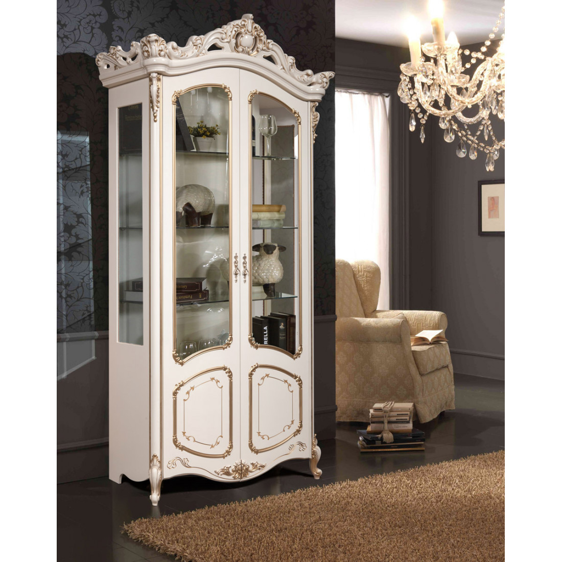 Шкаф-витрина двухдверная Элиза (беж) – данная модель сделает вашу гостиную неповторимой и нарядной. Ее стеклянные дверцы и зеркальный корпус придадут комнате светлую атмосферу, а стеклянные полки для посуды сделают эту витрину легкой и воздушной даже не смотря на ее мощный с первого взгляда фасад. Резные вставки в сочетании с тонкой росписью подчеркнут классический стиль и послужат показателем богатства и престижа хозяев дома.