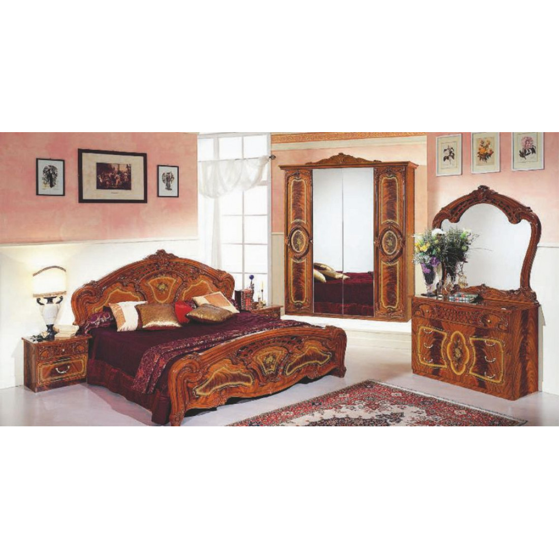 Спальня Роза (орех) от Российской фабрики "ДИА мебель". Выполнена в классическом стиле. Такая спальня коллекции Роза порадует Вас своим дизайном и многофункциональностью. Ореховый цвет в сочетании с глянцевым покрытием и орнаментом на фасадах, придает этой модели еще изысканности и подчеркивает прекрасное чувство стиля своего владельца. Поможет насладиться прекрасным вечером после трудного дня.